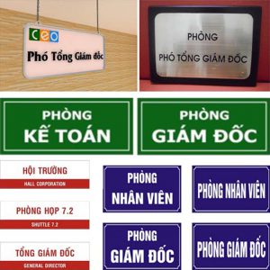 Mỗi công ty hay doạnh nghiệp đều có nhiều bộ phận, phòng ban với các nhiệm vụ khác nhau đảm bảo duy trì hoạt động của công ty một cách thuận lợi nhất. Và các phòng ban, bộ phận thì không thể thiếu được các biển phòng ban, nó vừa giúp nhân viên trong công ty phân biệt được các phòng ban, bộ phận, vừa giúp những người ngoài công ty khi đến có thể tìm được các bộ phận cần thiết một cách dễ dàng. Biển phòng ban hiện nay là loại biển thường được dùng để gắn trước cửa một phòng chức năng nào đó của công ty hay cơ quan và thường có những nội dung cụ thể như “Phòng Giám đốc ”, “Phòng Kinh doanh” “ Phòng nhân sự ”….